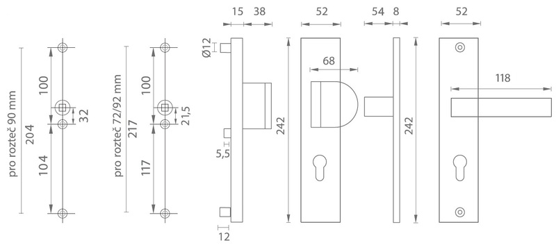 U bezpečnostního kování je třeba znát vzdálenost mezi osou kliky a osou klíče (rozteč). Standardní vzdálenost je 72, 90 nebo 92 mm. Kování s roztečí 72 a 90 mm je standardem pro tloušťku dveří od 38 mm do 50 mm. Kování s roztečí 92 mm je standardem pro tloušťku dveří od 68 mm do 78 mm.
