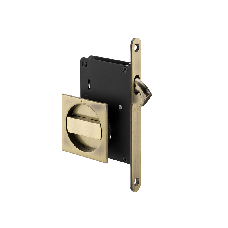 Zadlabací zámek pro posuvné dveře. Háček, čelo a protiplech jsou vyrobeny z nerezové oceli AISI 304. Dodává se s kompletní sadou zapuštěných mušlí.