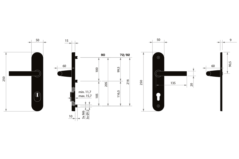 Kování se upevňuje třemi bezpečnostními šrouby, přičemž středový šroub je skrytý pod krytem. Model je dodávaný v roztečích 72 mm, 90 mm a 92 mm, takže se lehce přizpůsobí různým typům dveří.