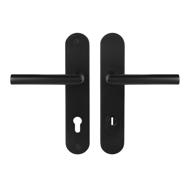 Kování je vyrobeno z odolného hliníku, navrhnuté s ohledem na dlouhodobé zatížení a spolehlivost. Dostupné je ve dvou moderních povrchových úpravách F5 - Černá matná a F9 - Nerez elox a ve variantách madlo/klika anebo klika/klika.
