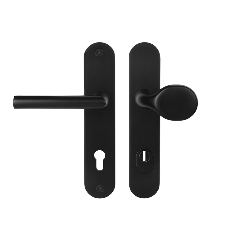 Kování je vyrobeno z odolného hliníku, navrhnuté s ohledem na dlouhodobé zatížení a spolehlivost. Dostupné je ve dvou moderních povrchových úpravách F5 - Černá matná a F9 - Nerez elox a ve variantách madlo/klika anebo klika/klika.