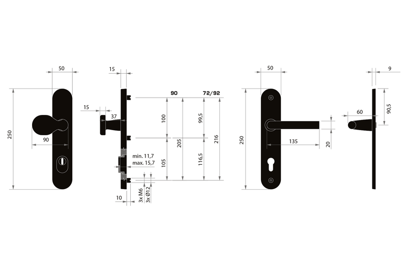 Kování se upevňuje třemi bezpečnostními šrouby, přičemž středový šroub je skrytý pod krytem. Model je dodávaný v roztečích 72 mm, 90 mm a 92 mm, takže se lehce přizpůsobí různým typům dveří.