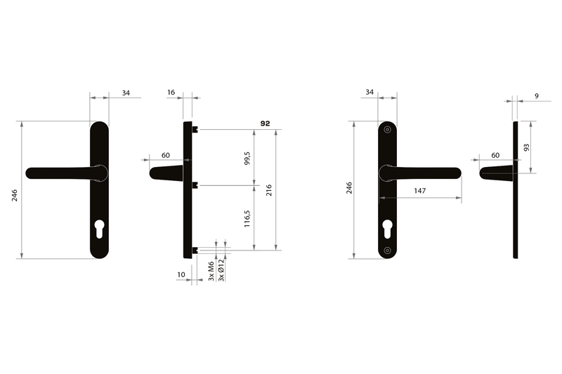 Kování se upevňuje třemi bezpečnostními šrouby, přičemž středový šroub je skrytý pod krytem. Model je dodávaný v rozteči 92 mm.