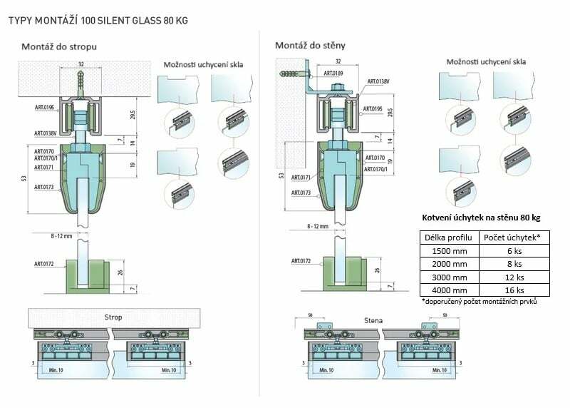 SC - POSUVNÝ SYSTÉM SERIES 100 SILENT GLASS 80 KG s oboustranným krytem na profil STM - Stříbrná matná