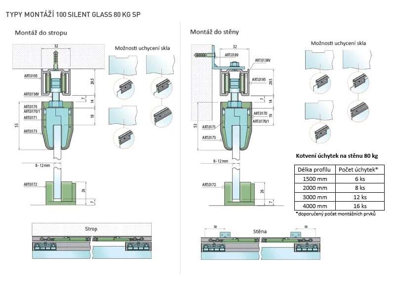 SC – posuvný systém SERIES 100 SILENT GLASS S pro jednokřídlé dveře 1D 2000/80 SP obsahuje: